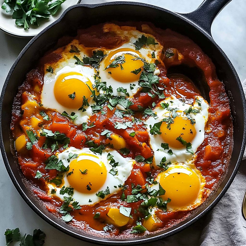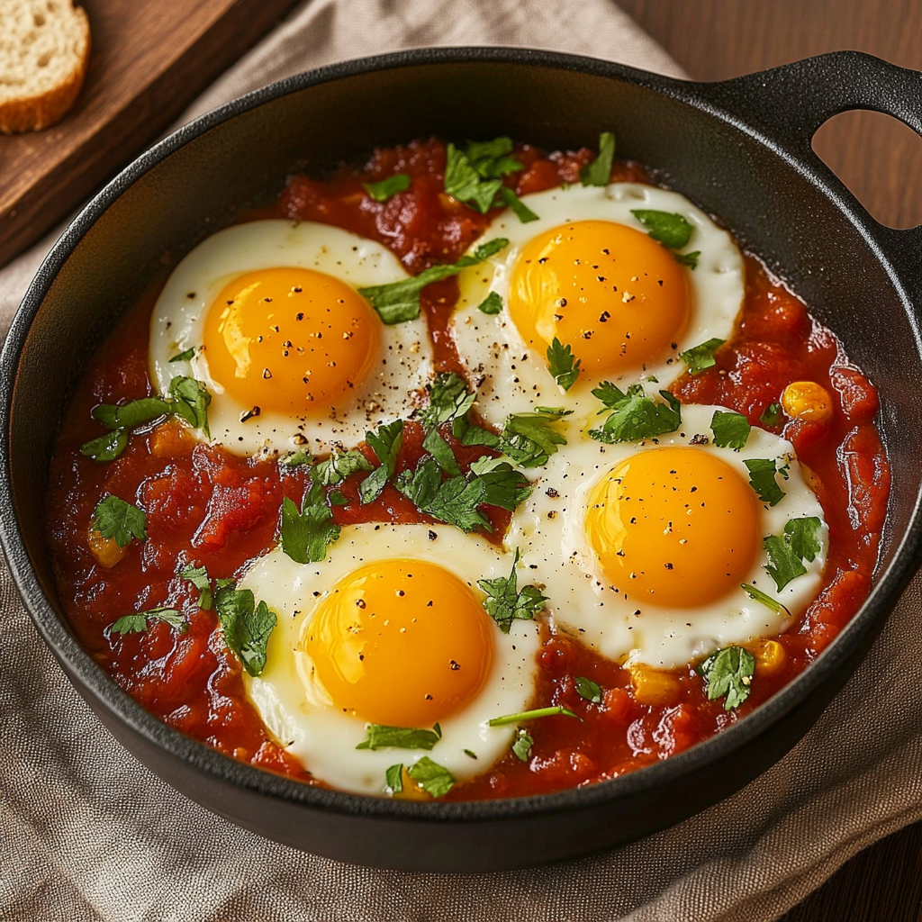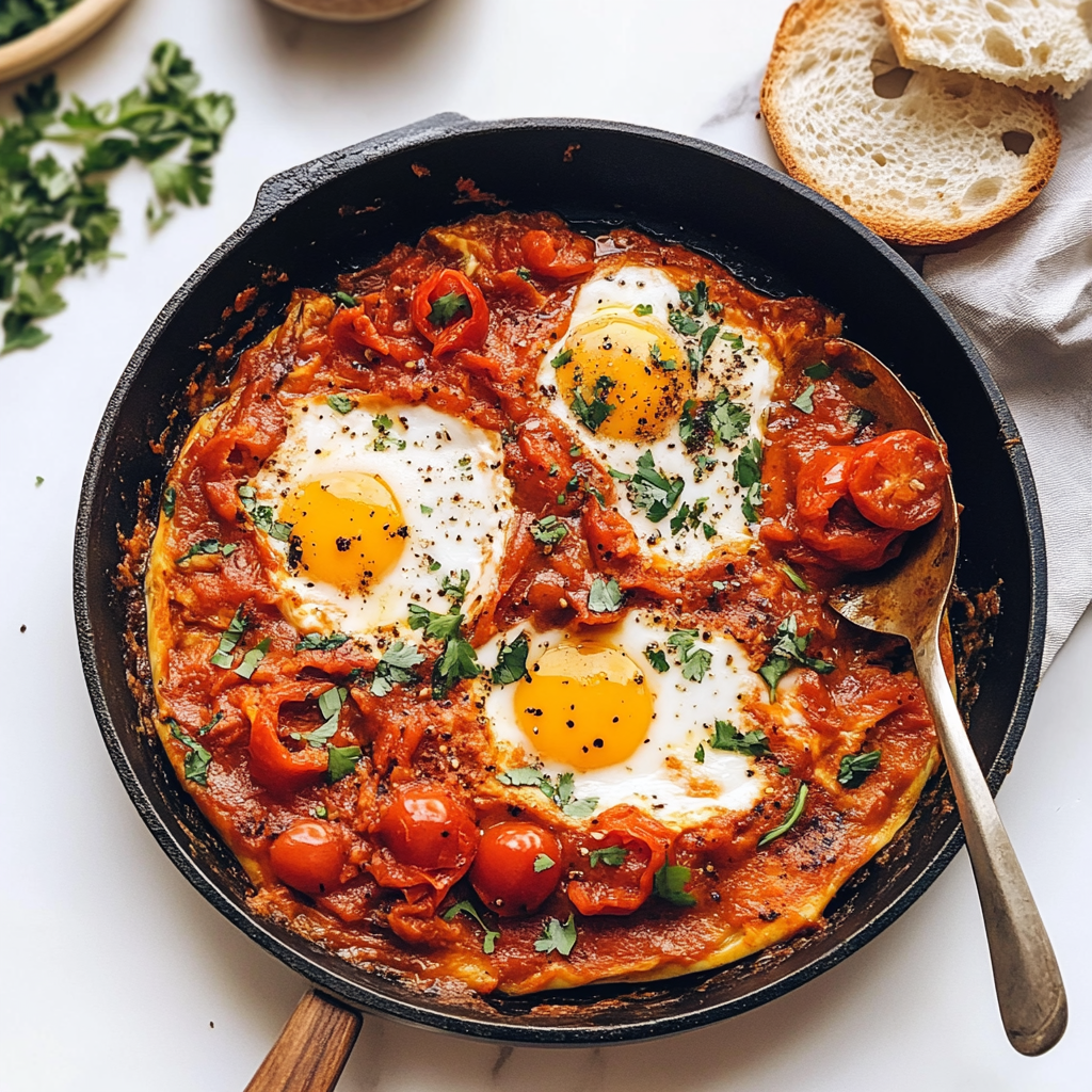 The sizzling sound of eggs cracking into a rich, spiced tomato sauce filled with blistered cherry tomatoes is enough to