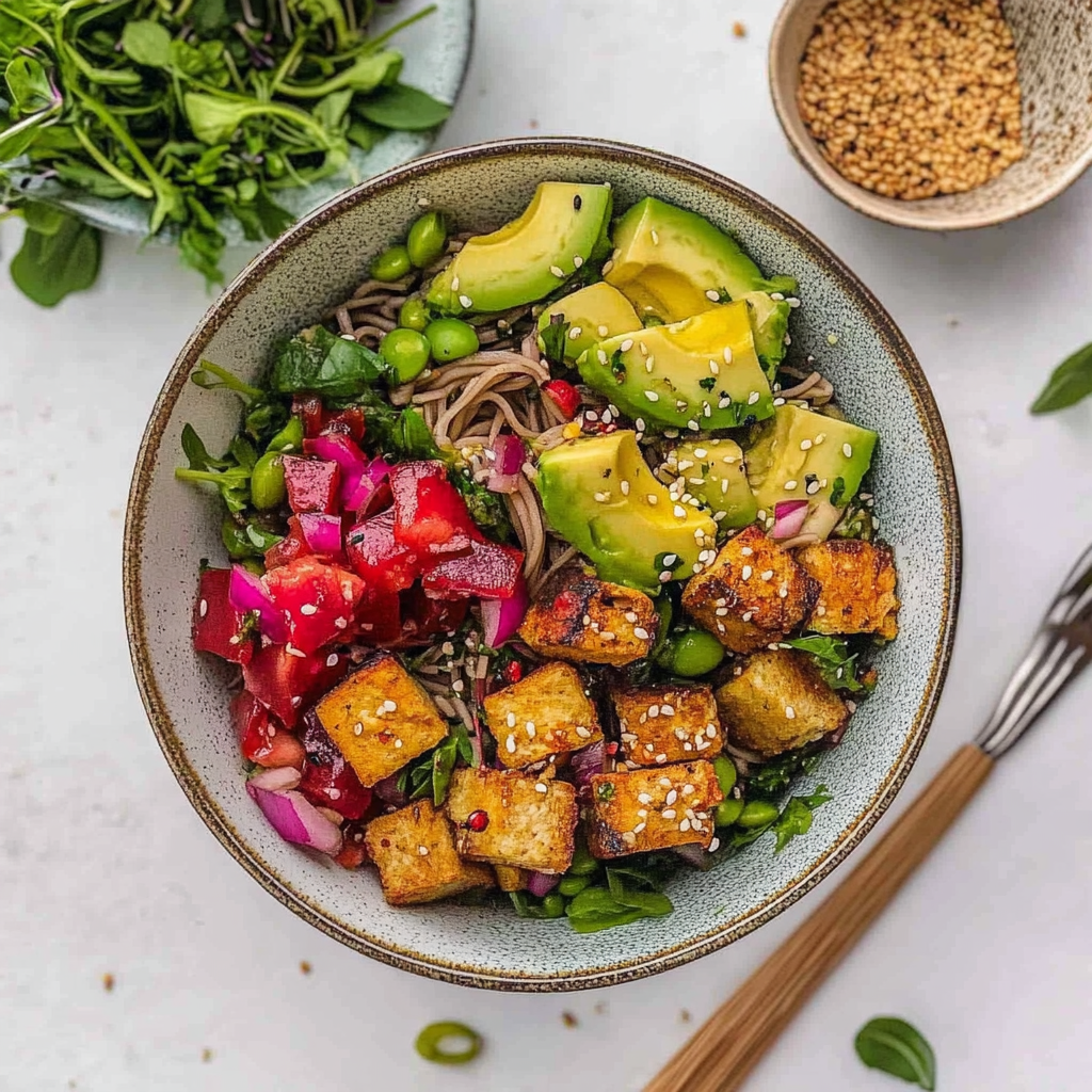 Imagine a bowl bursting with vibrant colors, where the luscious creaminess of avocado meets the satisfying chew of soba noodles,