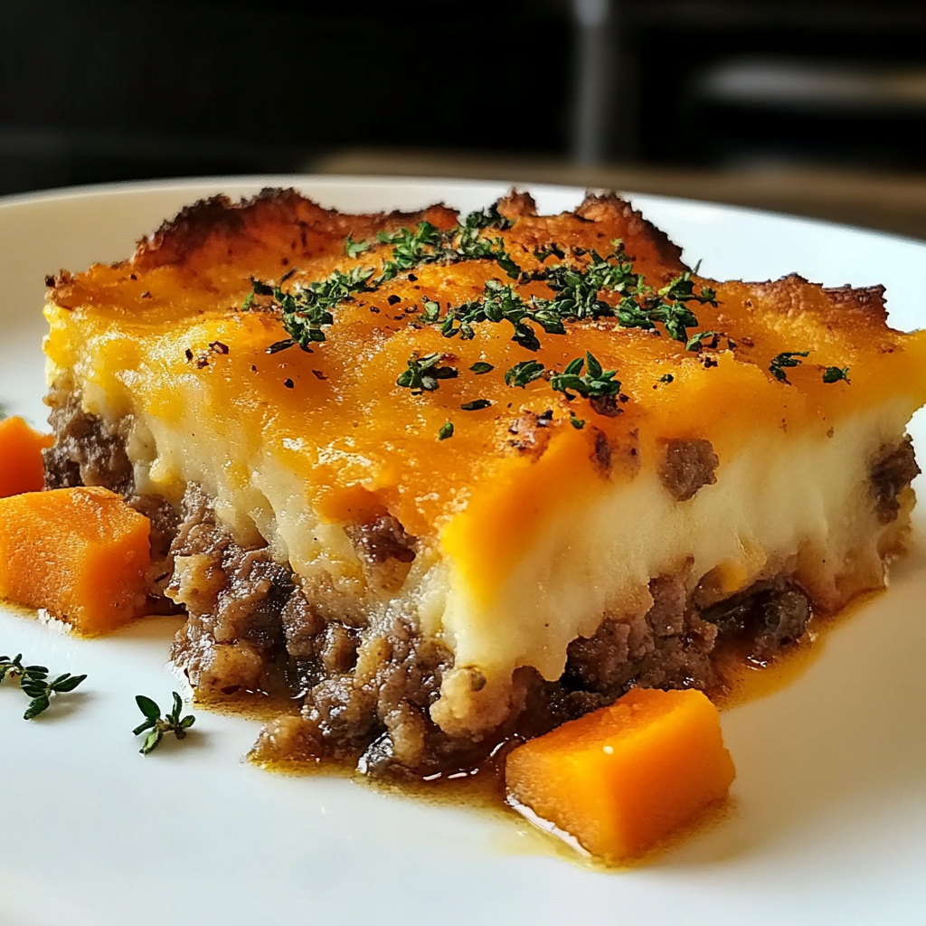 - Assemble the Pie: Spread meat mixture in a baking dish, layer mashed sweet potatoes on top, creating swirls with a fork.