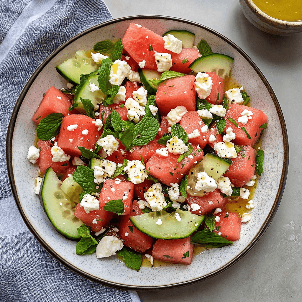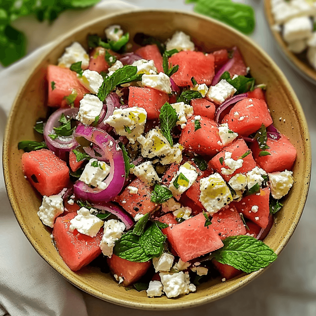 Watermelon Feta Mint Salad is a refreshing summer delight that combines juicy watermelon, creamy feta cheese, and aromatic mint leaves for a burst of flavor in every bite. Perfect for barbecues or light lunches, this vibrant dish offers a harmonious balance of sweetness and tang. With minimal effort and maximum taste, it’s the ideal choice for warm-weather gatherings.